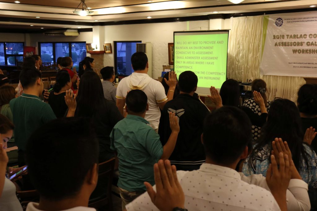After the workshop calibration, the participants lead by the recently elected Tarlac Trainers Association President Marnie Q. Diamse took the Assessor’s Oath.