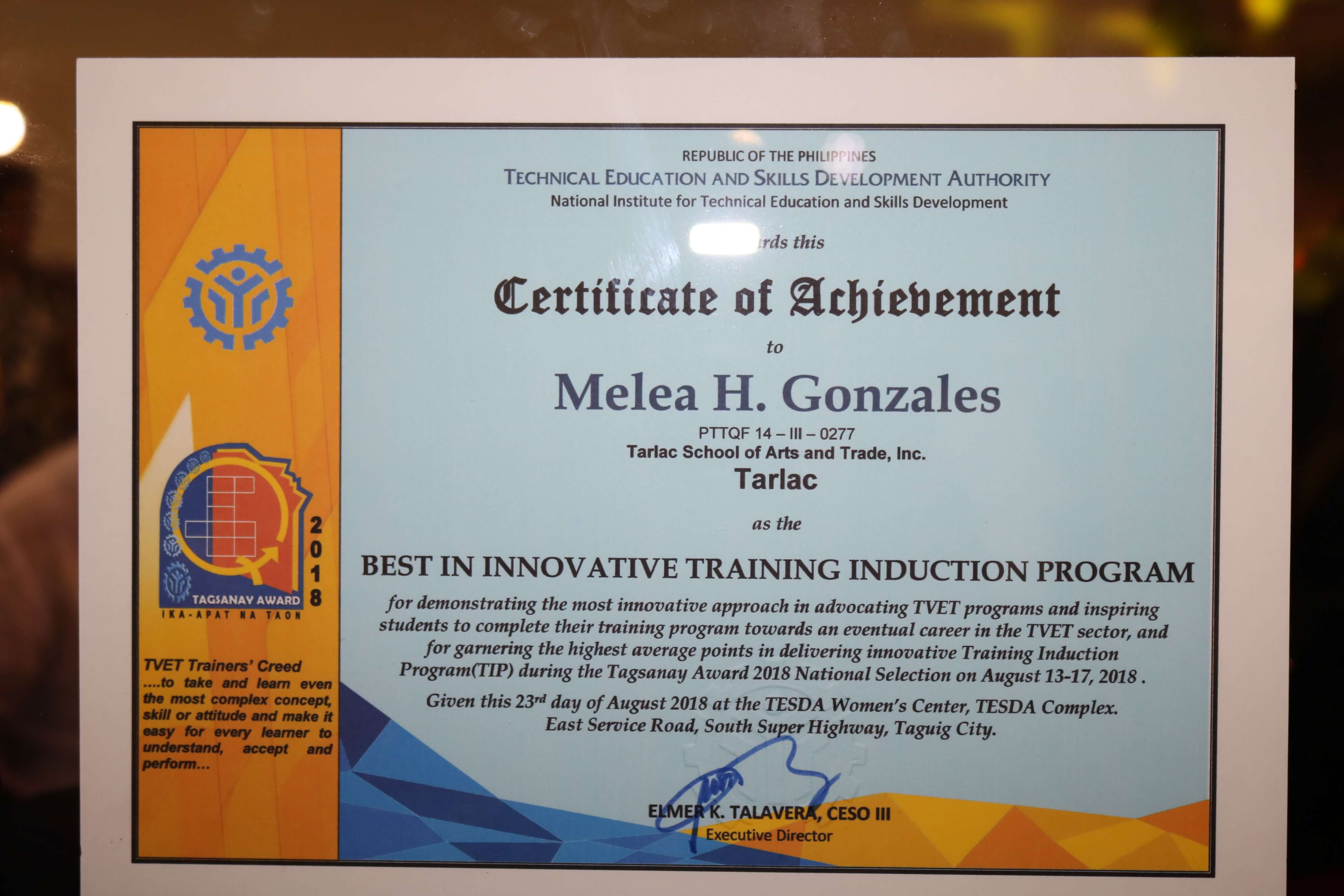 Tarlac Provincial Government Wins 2018 TESDA National Kabalikat Award